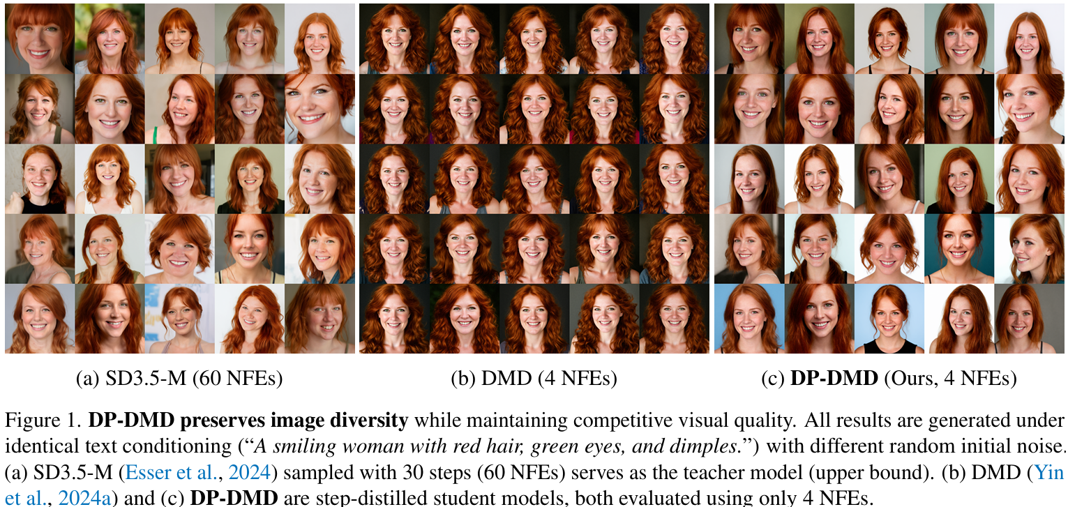A simple yet effective approach to preserving sample diversity under DMD, with no perceptual backbone, no discriminator, no auxiliary networks, and no additional ground-truth images.