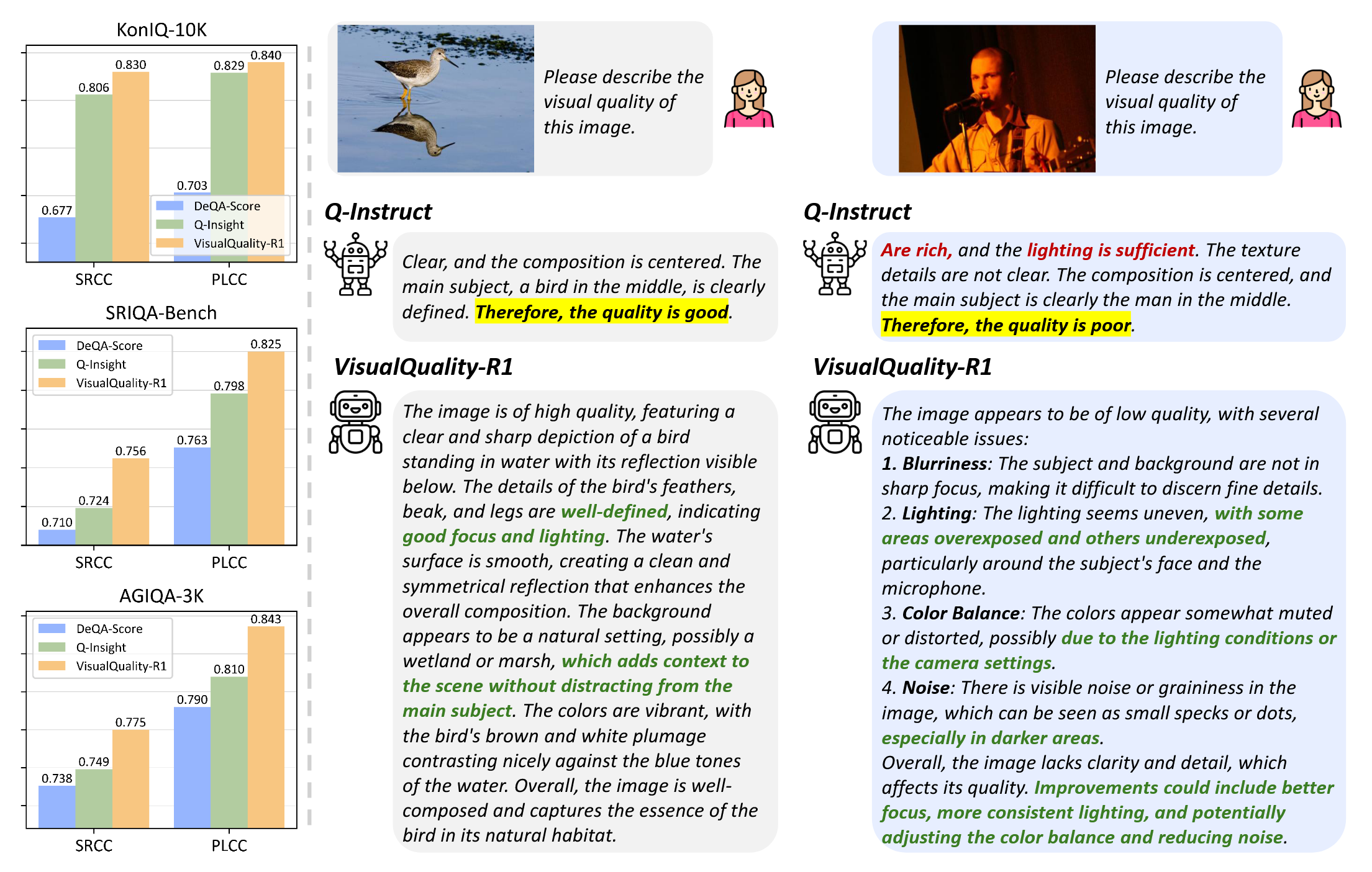A reasoning-enabled visual quality model capable of delivering both qualitative descriptions and quantitative ratings.